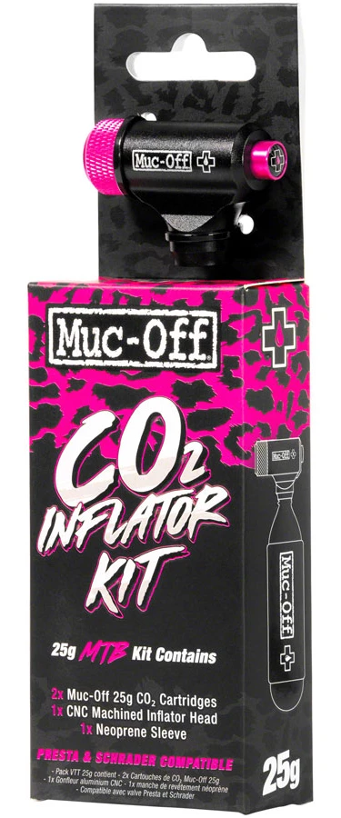 The Muc-Off Inflator kits help riders quickly inflate their tires and quickly get back to riding in no time. Each kit contains 2x cartridges, 1x compact and durable CNC-machined inflator head with soft-touch press down button which easily controls CO2 release. Dual head nozzle compatible with Presta and Schrader valves and 1x neoprene sleeve to help avoid freeze burn.