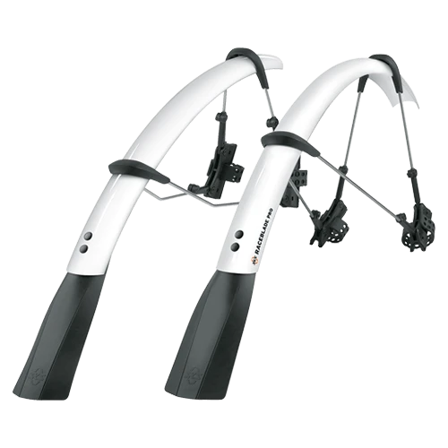 The ultimate clip-on mudguard set for road bikes for tire widths up to 25mm. Its smart, double-hinged quick release fitting system also fits aero forks and is also compatible with disc brakes, direct mount brakes, and thru axles. Mudguards can be perfectly adapted to the radius of the wheel by adjusting the length of the stays. The superlight extra long mud flaps give additional spray protection. In addition to using the quick release rubber straps it can also be fixed in place with zip ties. Paintwork protection film for the frame is also included. Disc brake compatible: Please be mindful of the brake wire.