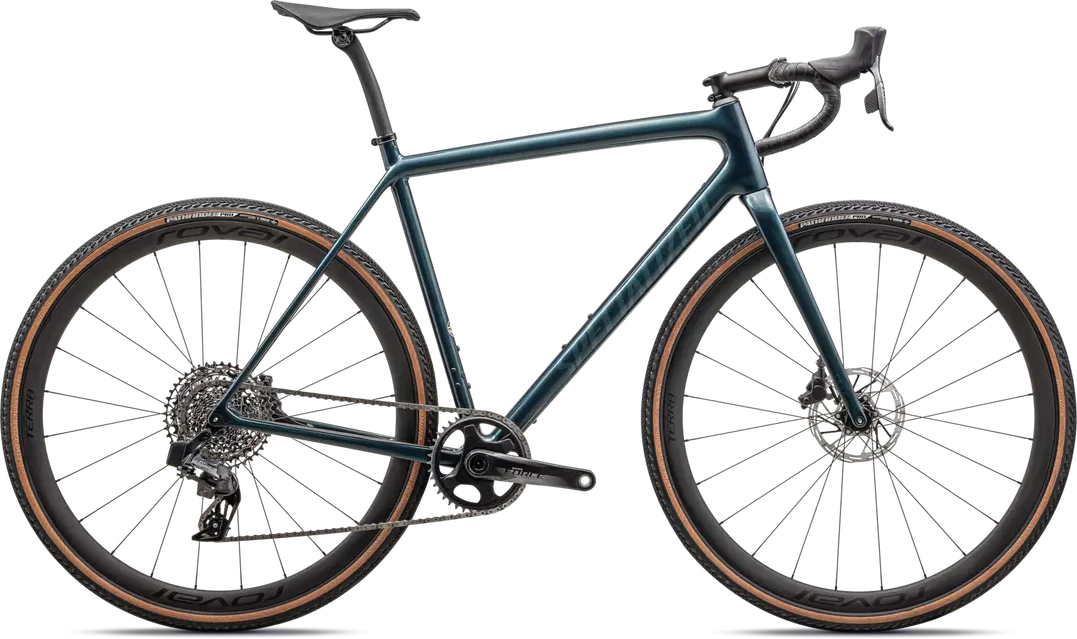 This Crux Pro comes spec’d with a accurate and quick-shifting SRAM Force 1 eTap AXS hydraulic disc groupset, lightweight and durable Roval Terra CL Disc wheels, and 2Bliss Ready, 700x38mm Pathfinder Pro tires that hookup over nasty terrain.