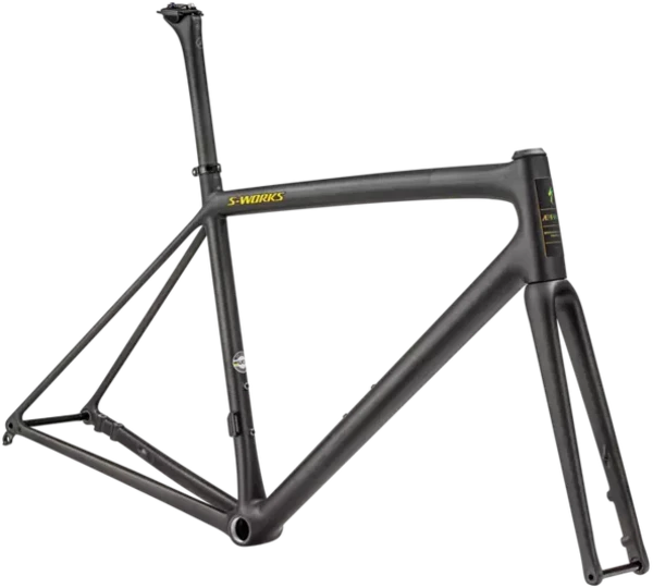 – The Satin Carbon/Jet Fuel colorway is ready to ride as is but features logos that are decals over a clear coat, so they can be easily removed if you choose to work with a custom painter. The frameset includes a second set of decals to be applied after painting. Keep in mind that when you modify the paint and/or graphics on your Aethos, the limited warranty provided by Specialized will no longer cover your paint and graphics. Any issues related to such modifications should be worked out between you and your custom painter.