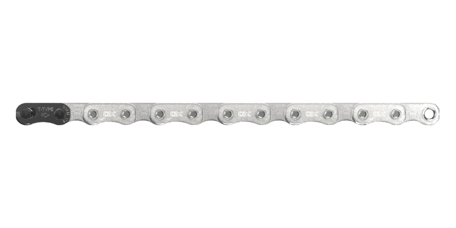 The GX Eagle Transmission (T-Type) chain is the strongest we have ever made. Specifically engineered to optimize Eagle Transmission, this all-new T-Type design features a unique flat top. In addition to this shape maximizing shifting performance and upgrading the aesthetics of any bike, it is developed specifically for the added torque loads of E-MTB thanks to its solid pins that give it incredible strength.